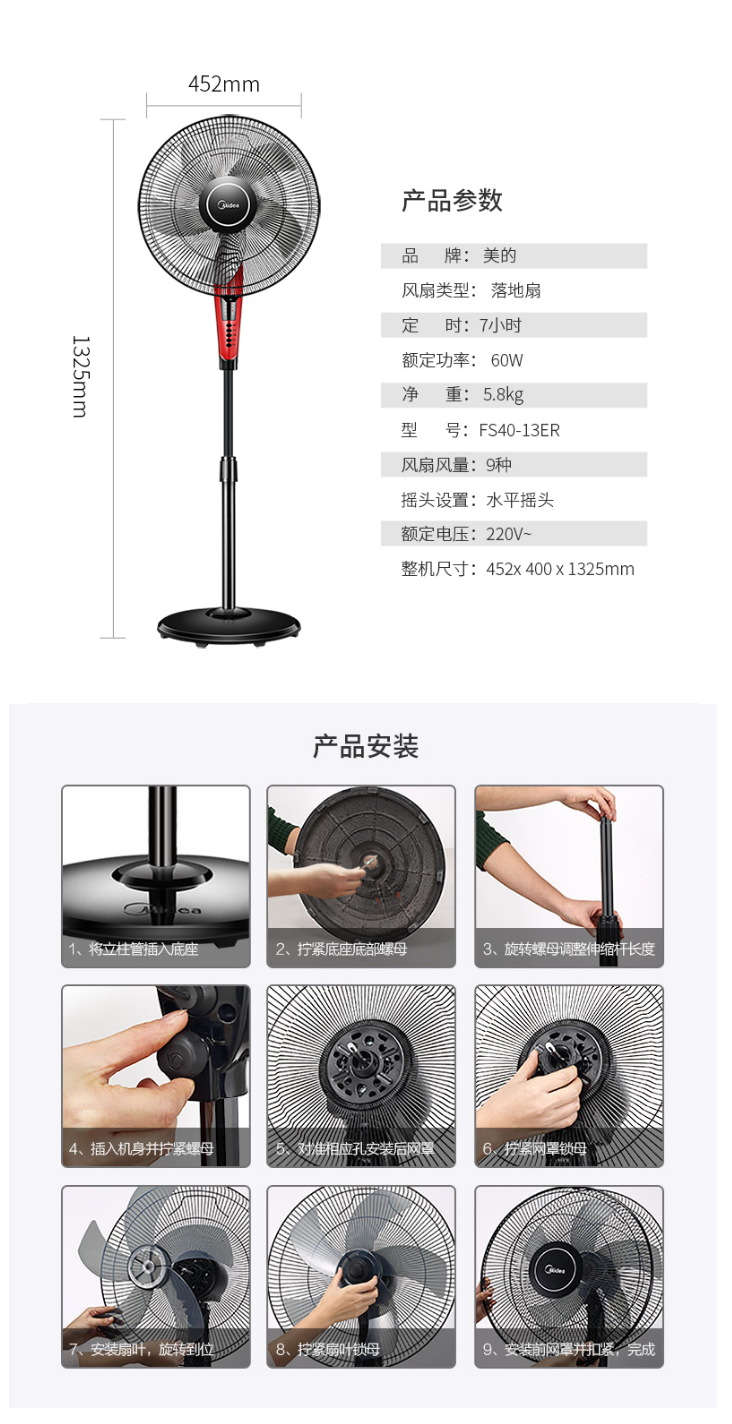 美的(Midea)FS40-13ER电风扇/五叶遥控落地扇 自营