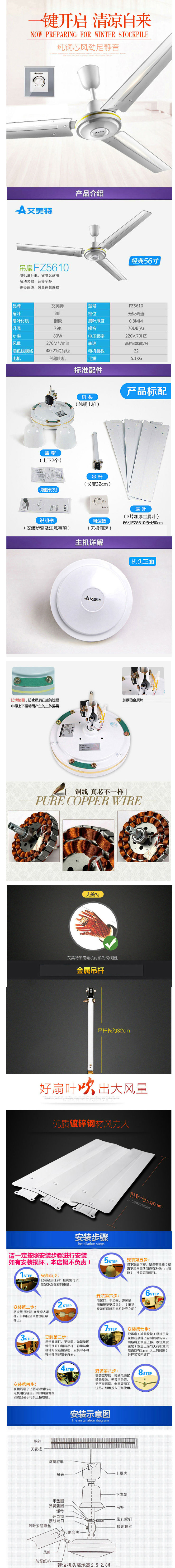 艾美特1.4米静音吊扇吸顶扇纯铜电机FZ5610风扇 自营