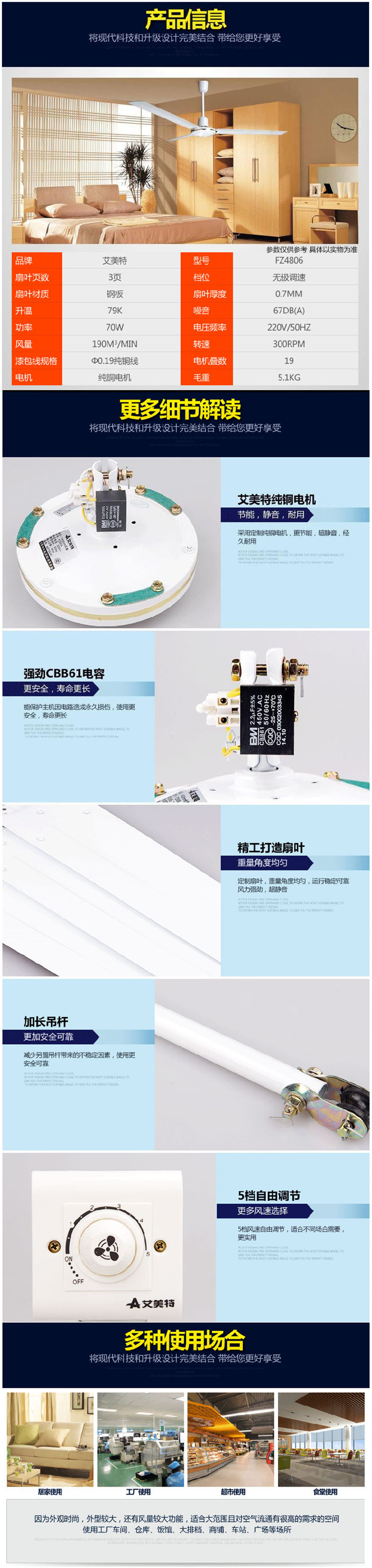 艾美特1.4米静音吊扇吸顶扇纯铜电机FZ4806风扇 自营