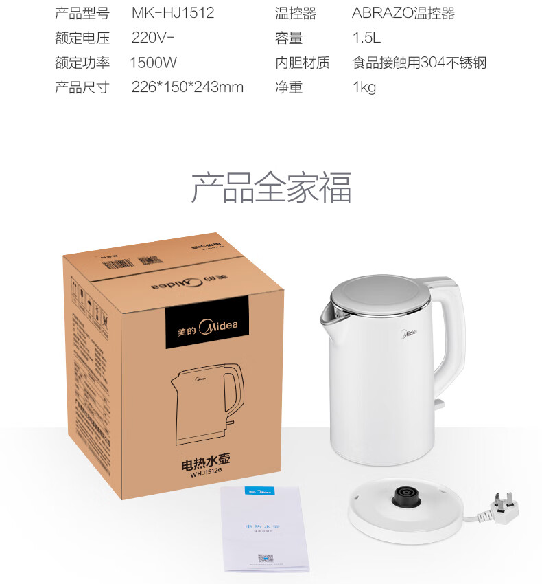 美的(Midea)电水壶热水壶电热水壶304不锈钢水壶双层防烫烧水壶MK-HJ1512(WHJ1512e) 自营