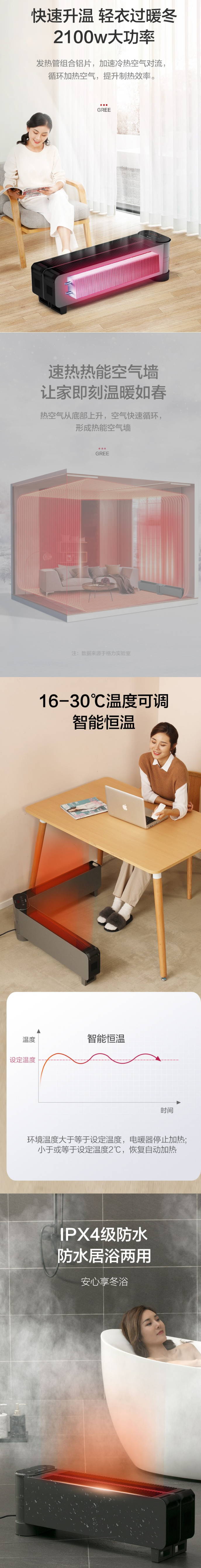 格力(GREE)家用智能遥控移动地暖电暖气电暖器防烫IPX4防水踢脚线取暖器暖风机NDJD-X6021B 自营