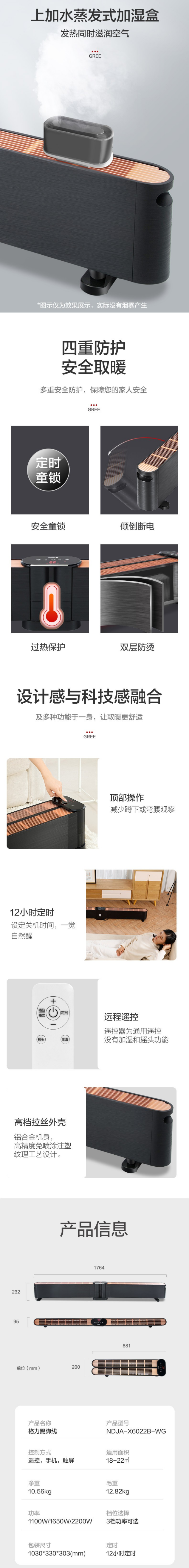 格力(GREE)家用智能WIFI遥控移动地暖电暖气加湿电暖器防烫IPX24防水踢脚线取暖器NDJA-X6022B-WG 自营