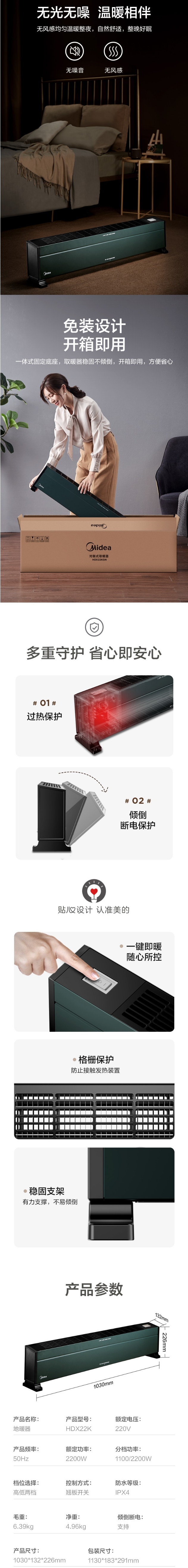 美的(Midea)HDX22KGN踢脚线取暖器电暖器家用电暖气家用电暖风移动地暖机对流式低噪储热浴室干衣机HDX22KGN 自营