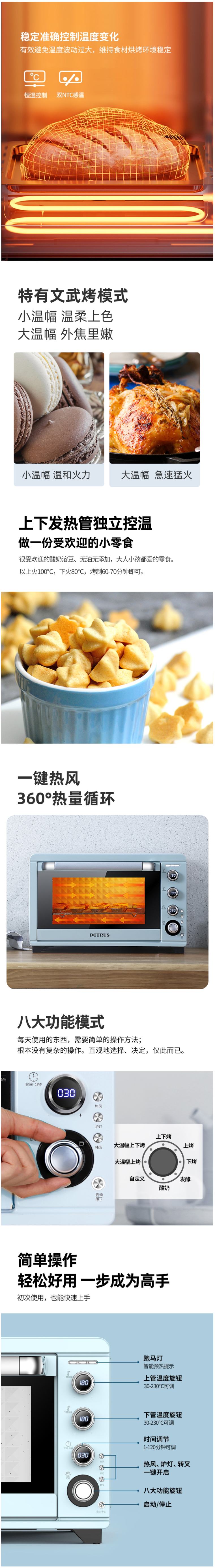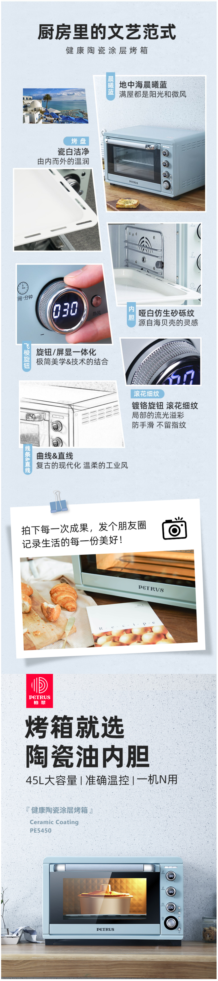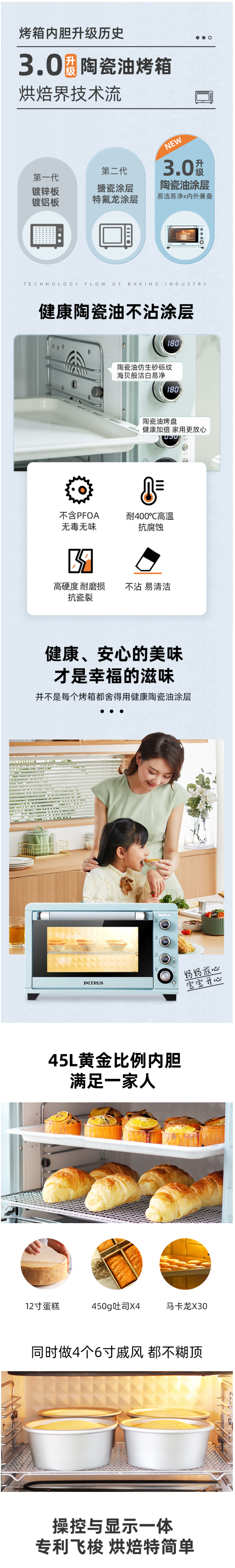 柏翠(petrus)电烤箱家用45升大容量多功能独立控温热风烤红薯陶瓷油内胆PE5450 自营