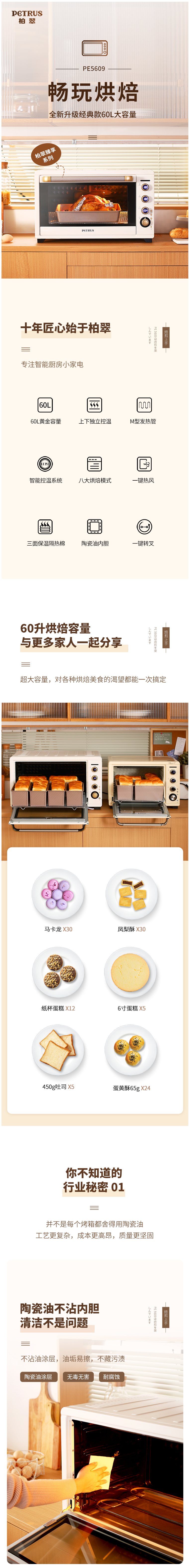 柏翠(petrus)电烤箱60L大容量家商两用智能烘焙PE5609白 自营
