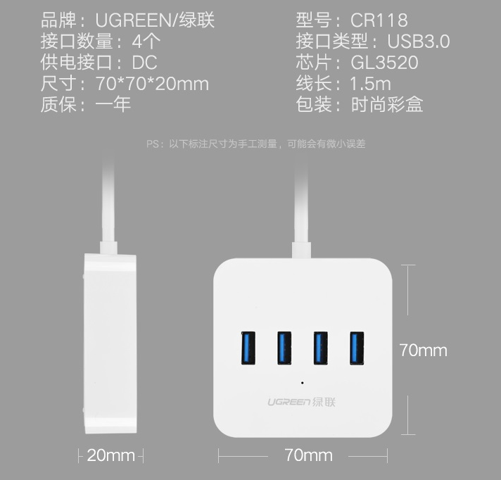 绿联(UGREEN)30221USB3.0分线器一拖四延长线1.5m