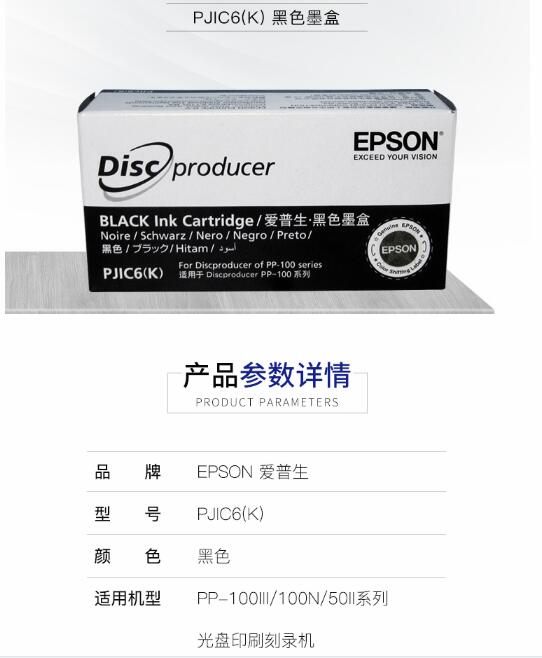 爱普生(EPSON)PJIC6(K)黑色墨盒适用于(PP-100III/100N/50II系列光盘印刷刻录机) 自营