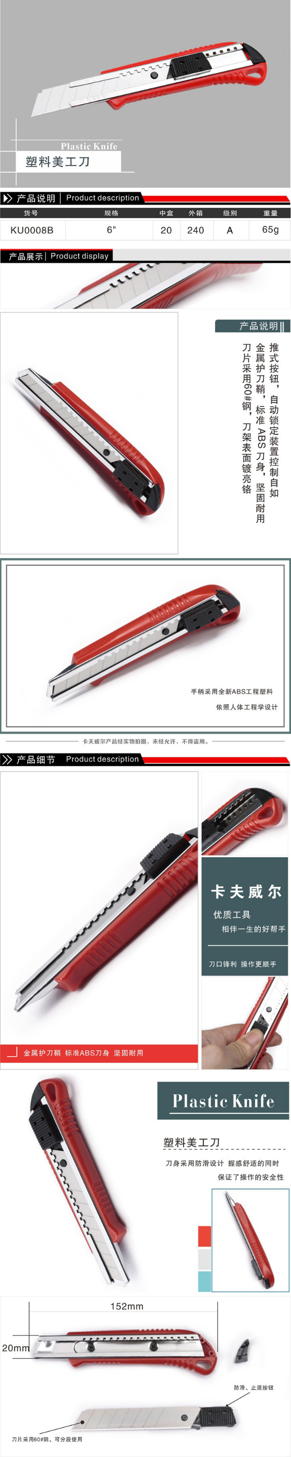 卡夫威尔6英寸塑料美工刀裁纸刀壁纸刀办公家用拆快递削笔刀大号18mm刀片宽度KU0008B 自营