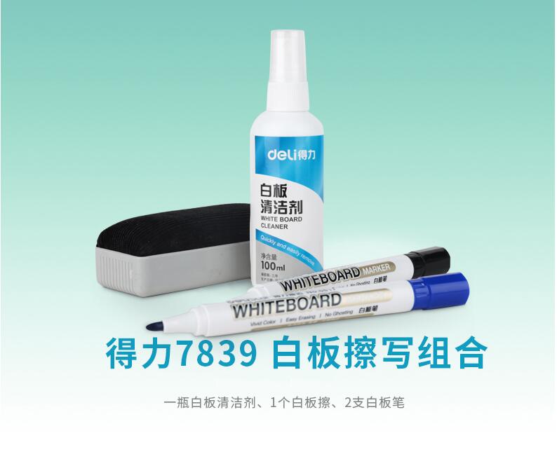 Deli得力白板擦组合(1支蓝色白板笔+1支黑色白板笔+白板擦+白板清洁剂)783912个/盒 自营