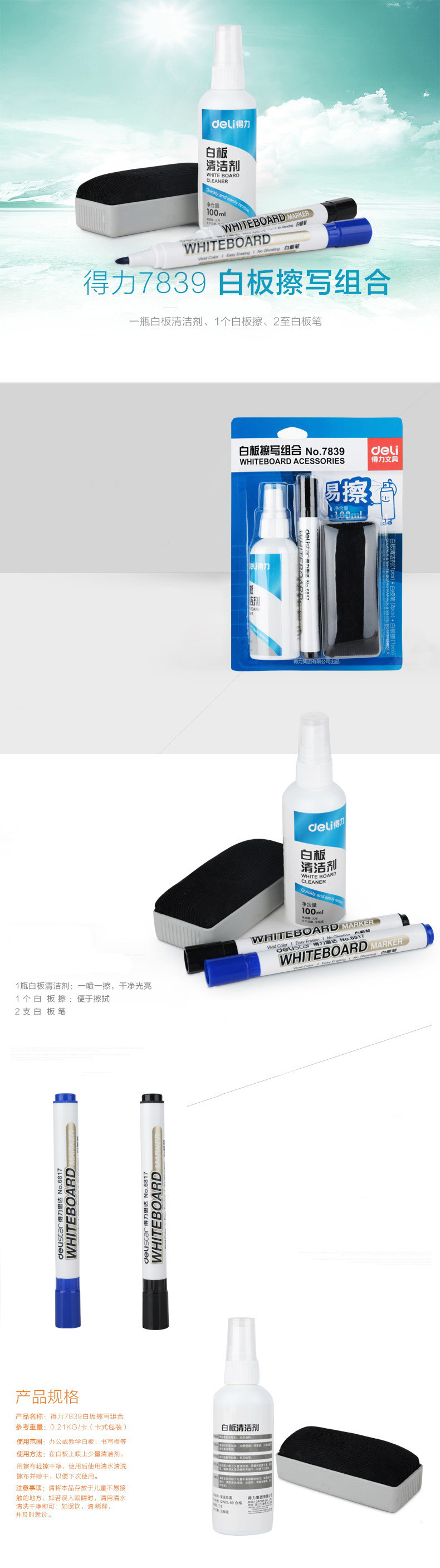 得力可擦易擦白板清洁白板擦写组合套装7839 自营