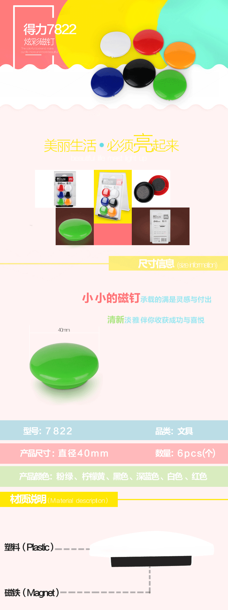 得力7822磁钉Ф40mm磁扣白板磁钉/磁珠/吸铁石 自营