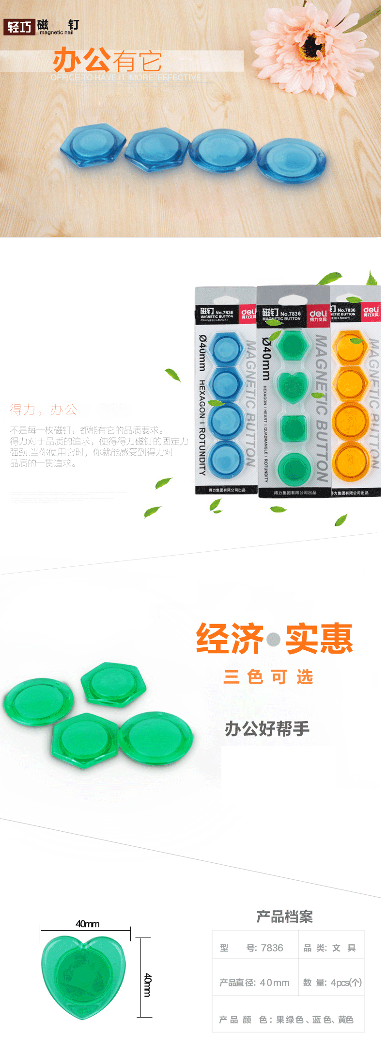 得力彩色磁钉7836白板磁扣/吸铁石/磁粒磁力超强 自营