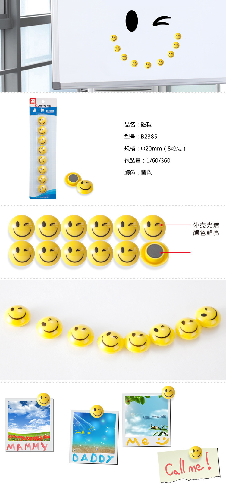 齐心BB2385黄办公用品白板磁扣粒20mm8粒装颜色:黄色 自营