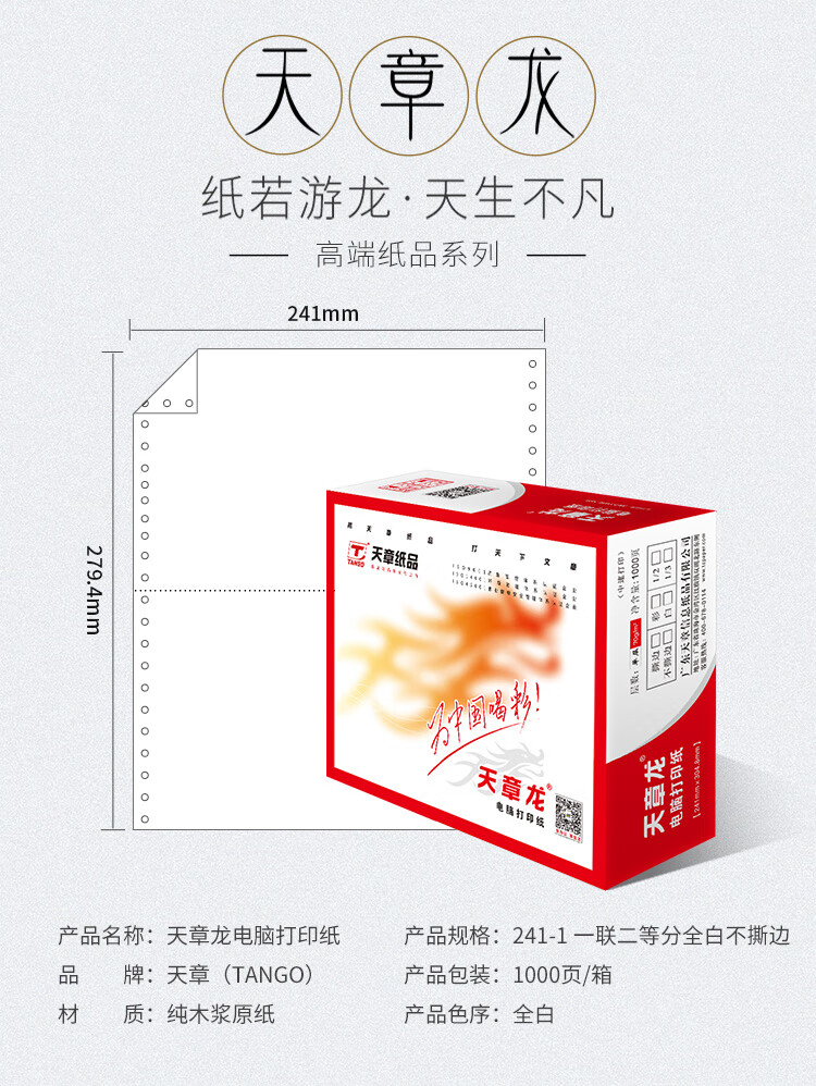 天章(TANGO)天章龙一联二等分不撕边电脑打印纸针式打印纸241-1-1/2(色序:全白1000页/箱) 自营