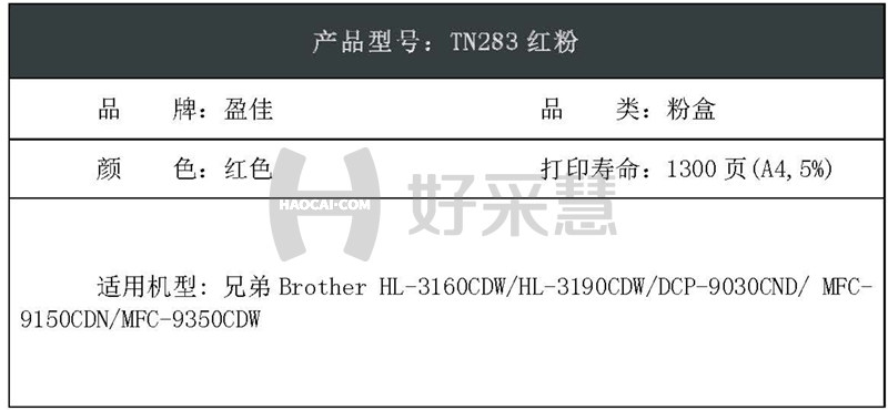 盈佳(YJ)TN283红粉粉盒红色1300页(A4,5%)适用兄弟BrotherHL-3160CDW/HL-3190CDW/DCP-9030CND/MFC-9150CDN/MFC-9350CDW 自营