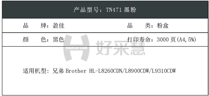 盈佳(YJ)TN471黑粉粉盒黑色3000页(A4,5%)适用兄弟BrotherHL-L8260CDN/L8900CDW/L9310CDW 自营