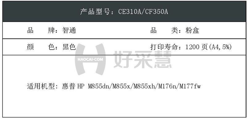 智通(ZT)CE310A/CF350A粉盒PLUS系列黑色1200页(A4,5%)适用惠普HPM855dn/M855x/M855xh/M176n/M177fw 自营