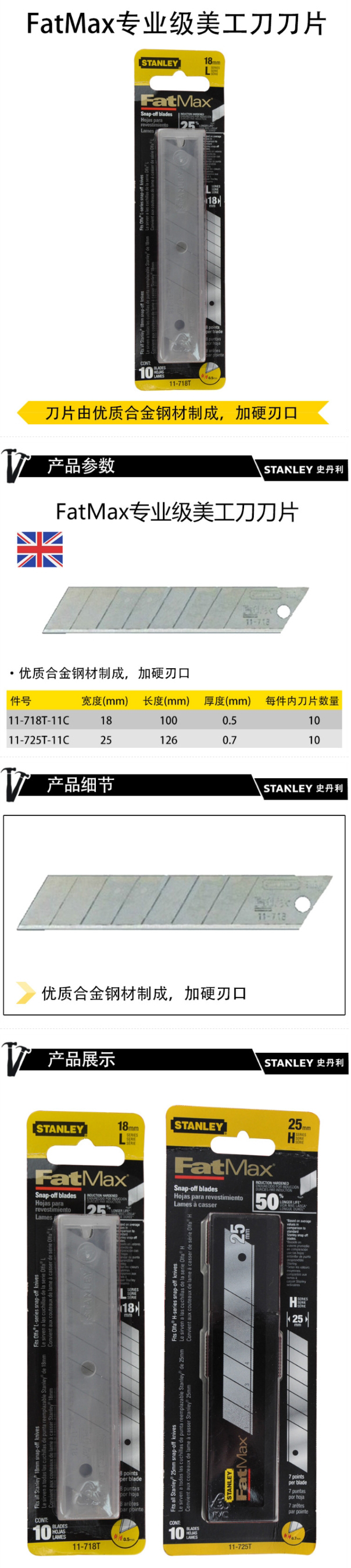 史丹利11-718T-11CFatMax专业级美工刀刀片18mm10片/卡 自营